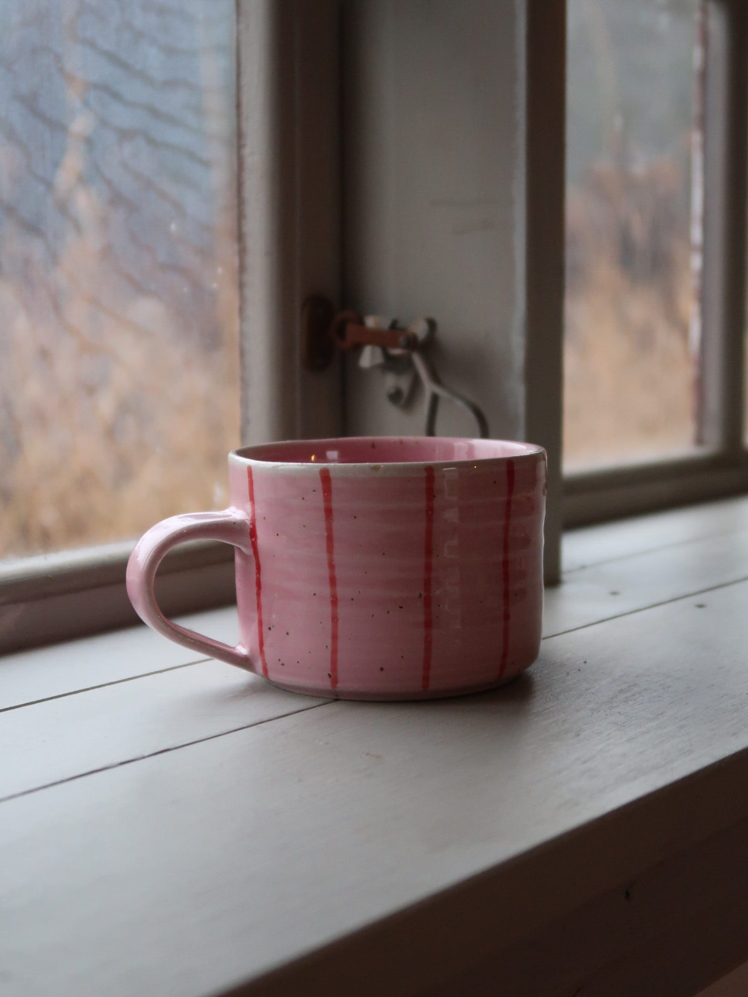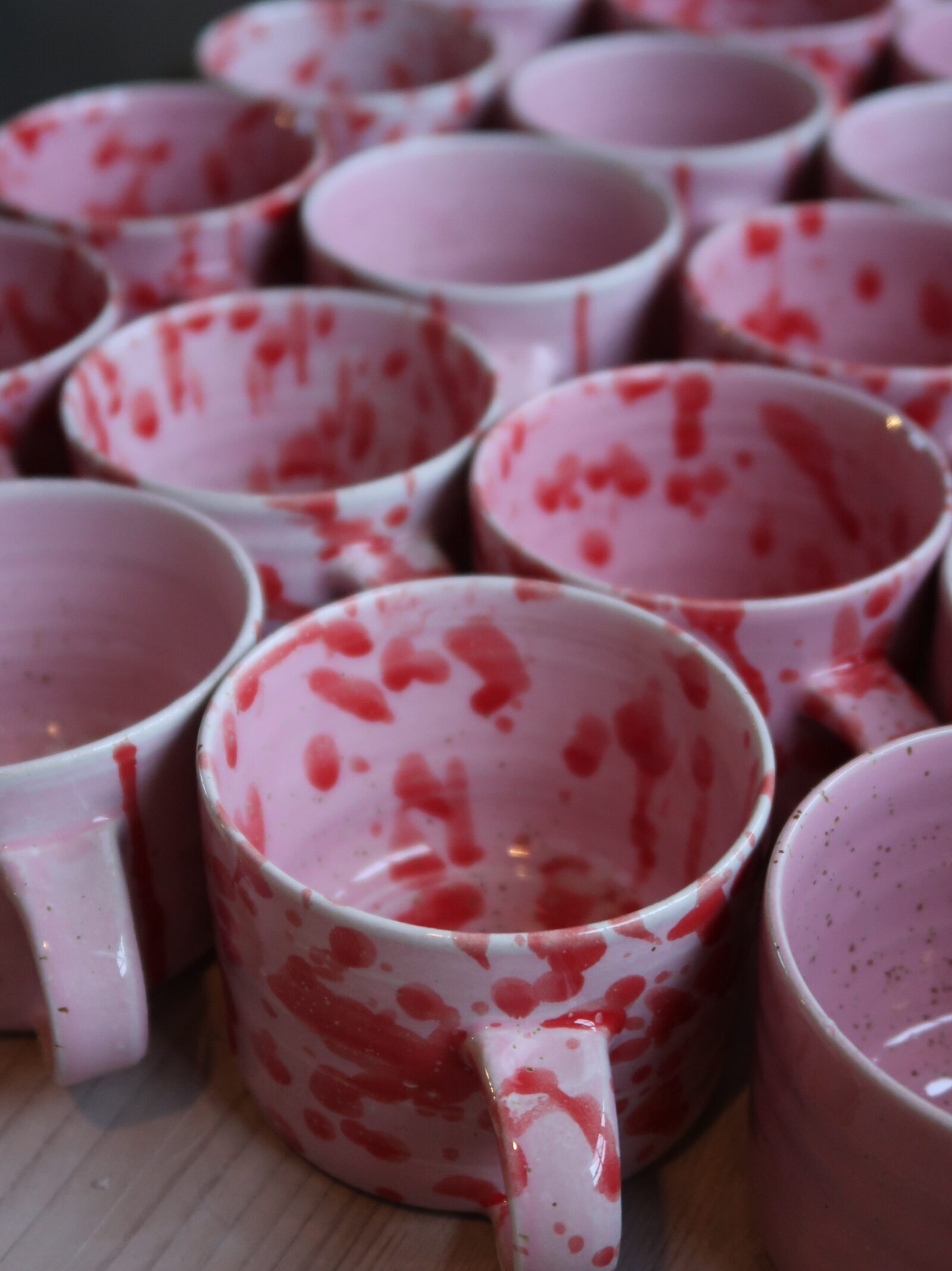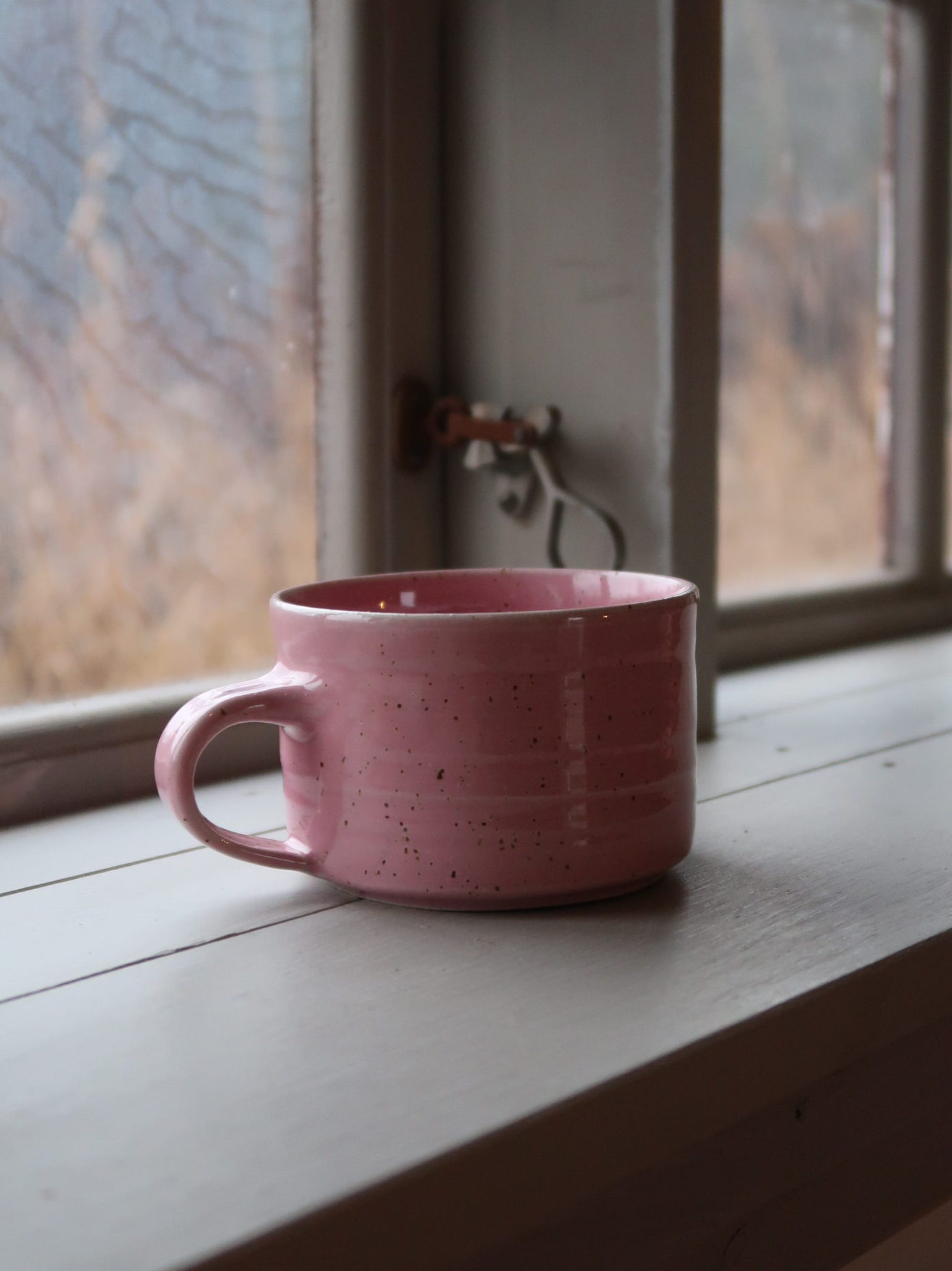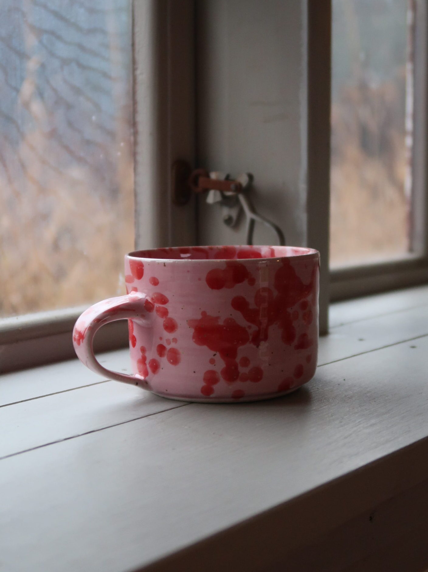 En handgjord kopp i mjukt rosa glasyr med lavaprickar.